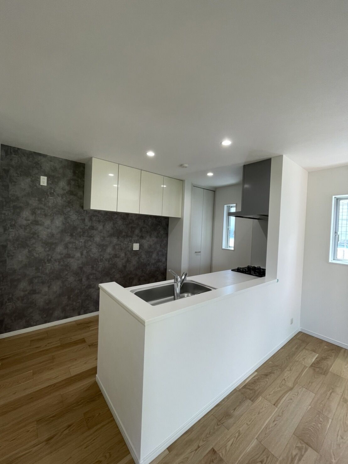 木目とグレーを基調にしたモダンな内装に仕上げています。